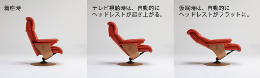 よりリラックスを求める方は、リクライニング機能のニーズが高く、ザ・ファーストは日本のプレミアムチェアとして、自動可変のヘッドレスト機能を持たせました。テレビを見る姿勢ではヘッドレストが起き上がり、頚椎をサポートし、寝姿勢に入る場合は、一定の角度からは背もたれを倒すと同時に自動的にヘッドレストがフラットになります。そしてリクライニング時に背もたれとシートが独立して動くことで、今までのリクライナーの欠点であった腰部が開いてしまうということを防いでいます。これにより心地よいフルフラットを実現しています。