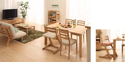 シンプルだから、どんなお部屋にもコーディネートしやすいカタチ。やさしい丸みは、小さなお子様にも安心。サッと汚れが拭き取れるテーブル天板や、とっても軽い設計の椅子は、働くママの家事をラクにしてくれます。