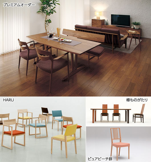 IFFTでは、それらの代表的な製品を展示いたします。ラバートリー材(マレーシア)では、ロングライフモデルの食堂椅子(CT17モデル)を展示。アメリカ広葉樹としては、ウォールナットやチェリー・メイプルが人気の、プレミアムオーダーを展示します。PEFC森林認証では新商品ピュアビーチ群より椅子を展示。また、小径木未利用楢材を使用したHARU(ハル)と、サントリー酒類株式会社様へOEM供給を行っております「樽ものがたり」も昨年に引き続き出展いたします。樽ものがたりはウイスキー醸造で使用した樽材を曲げ戻し、家具用材としてリサイクルした材を使用した家具です。