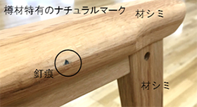 木材はひとつとして同じ木目はなく、オーク材特有の虎斑(とらふ)、心材(しんざい)辺材(へんざい)の材色差があります。カリモク家具ではそれらを天然木の証としてナチュラルマークと呼んでいます。