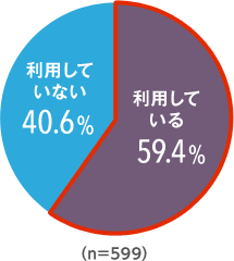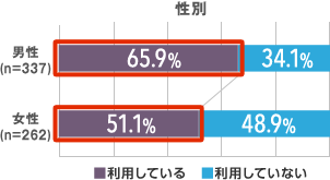デスクの利用状況は、約60%が「利用している」と回答。性別で見ると、デスクを利用しているのは男性が65.9%、女性は51.1%。男性の方が割合は多いが、女性も半数以上がデスクを利用している。