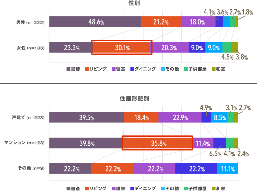 - 女性は書斎よりもリビングにデスクを置く人が多くなっている。また、住居形態別では、書斎にデスクを置いているのは戸建て・マンションともに約40%とほぼ同じ割合だが、リビングに置いている割合がマンションのほうが2倍ほど多い。マンションでは部屋数やスペースの都合で、リビングへの設置を選択していると考えられる。