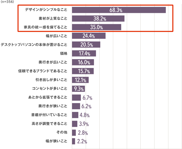 - 約70%が「デザインがシンプルなこと」を求めている。2位・3位は「素材が上質なこと」「家具の統一感を保てること」が入り、部屋になじむ上質感が求められている様子がうかがえる。