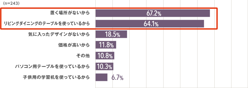 デスクの設置は住居形態によるところも大きく、戸建てのほうがデスクを使っている人が多い結果でした。デスクを使っていない人も「置く場所がない」「リビングダイニングのテーブルを使っている」を理由に挙げる人が多く、必要性を感じながらも置けない状況がうかがえます。