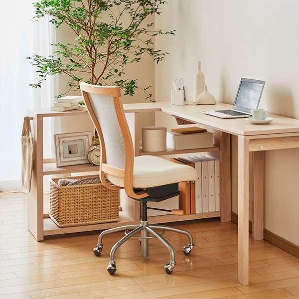 XT42モデルはS字に描かれた背もたれのフレームが特徴。腰にはほどよいサポート感があり、張り込まれたメッシュが背中全体を優しく包む。成型合板ならではのしなやかさもまた心地よい。 コンパクトなデスクチェアだからリビングダイニングでのテレワークにも最適。