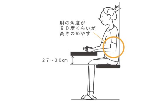 最適な高さは、一般的に椅子の座高との差が27~30cm 程度と言われています。椅子に座って軽く脇をしめ、テーブルに手を下ろした時、肘が90 度位になる高さが最適です。