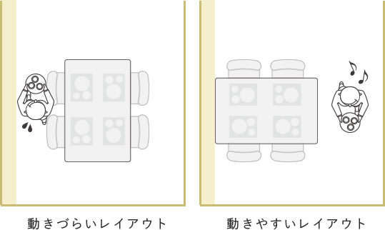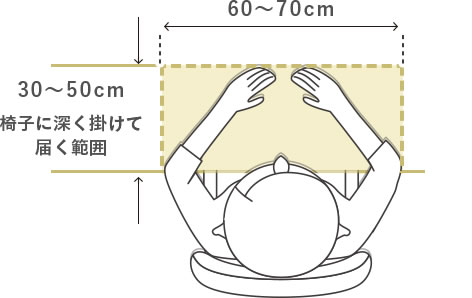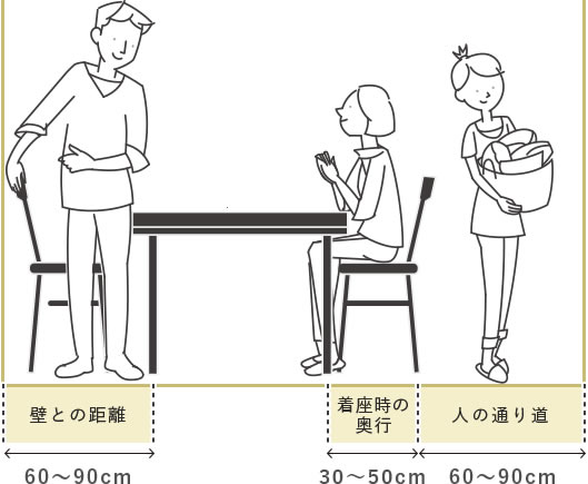 欲しい理想のサイズが、置きたい場所に適しているかをチェックします。椅子を十分引けなかったり、椅子に座った状態で回りに十分なスペースがないと、窮屈で使いづらい空間になってしまいます。