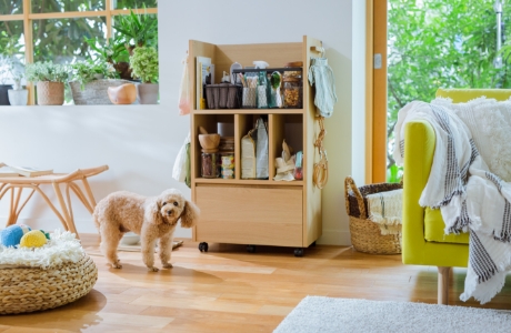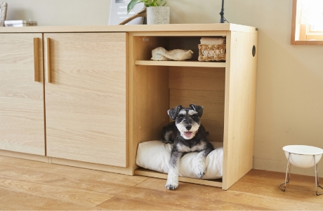 うちの子グッズの収納に。わんちゃんにおすすめの仕様は天板がメラミン素材で、おうち美容院にも。