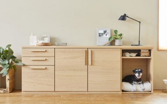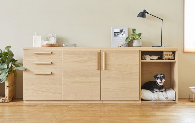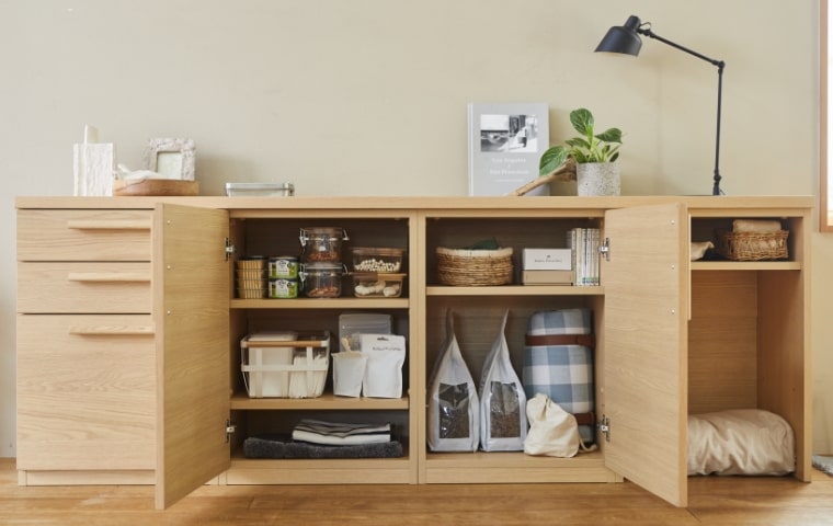 フードや衛生用品など非常時・災害時の備えの収納にも。わんちゃんの様々な食糧や日用品を隠してキレイに収納できるので、収納ストックの目隠し収納にもピッタリです。