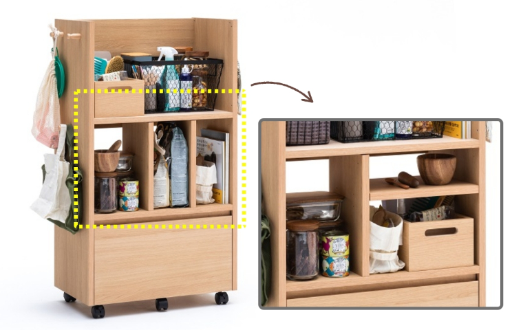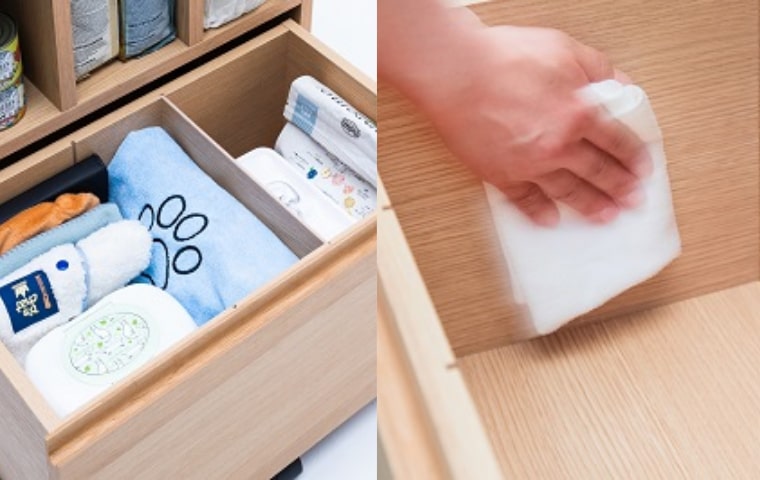 引き出し内面は防汚加工されているため、汚れてもサッと拭き取れて便利です。仕切りもあるので、フードやおやつ、衛生用品などの収納におすすめです。