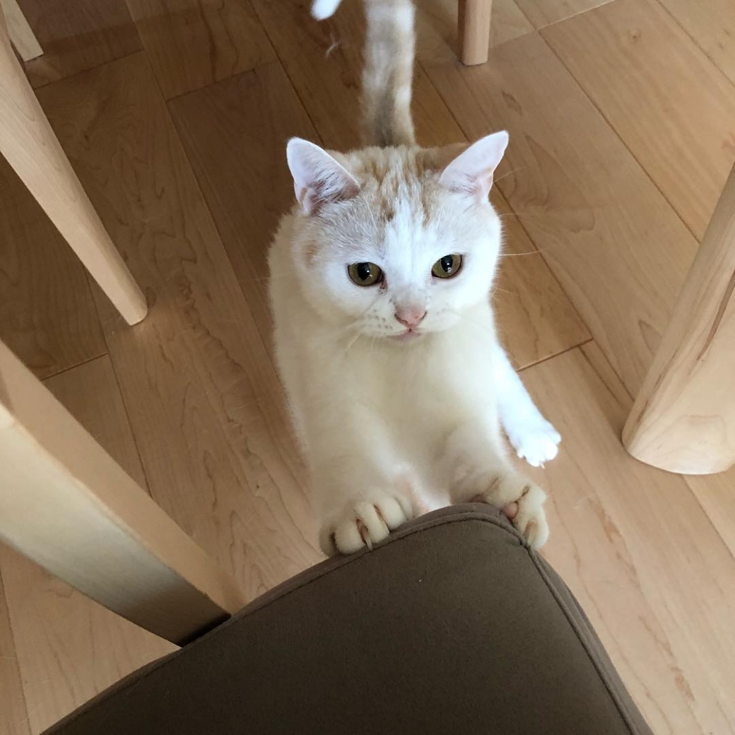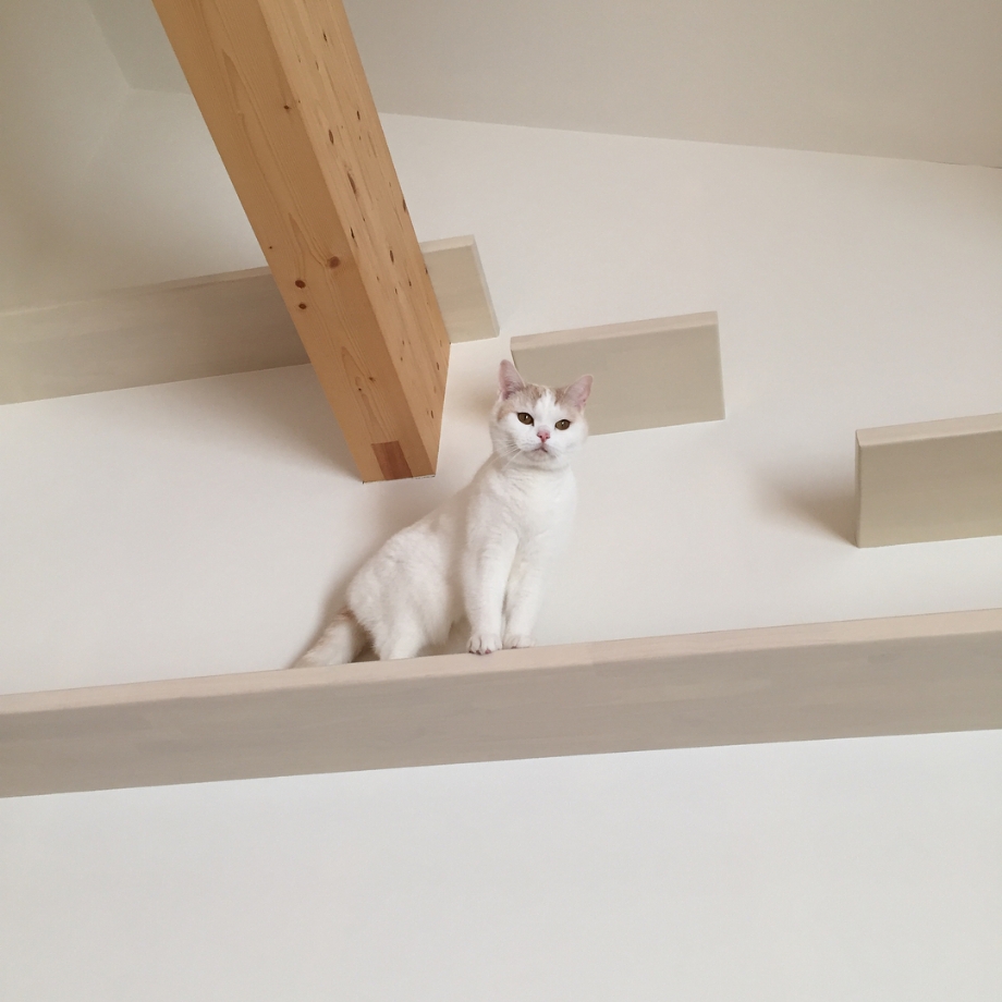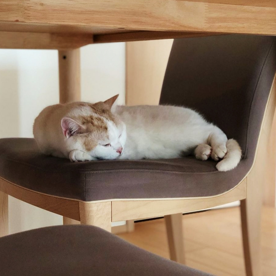 家を買ったのが、はに丸を飼い始めてからだったので、家はかなり猫仕様になっています。 キャットウォークや、猫⽤トイレを下に置けるような壁⾯収納を作ってもらいました。 カリモク家具のダイニングチェアも、はに丸が引っかいてもいいように「ディナミカ」という張地を張ってもらっています。 前に使っていたチェアの座⾯が、はに丸にビリビリに破られてしまったという苦い経験があるので……。
