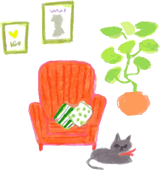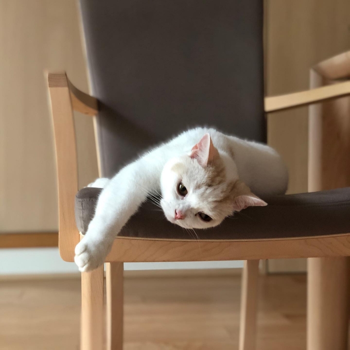 このチェアにしてからはチェアで⽖とぎをすることはほとんどありませんね。でも、不思議なことに、私や夫がチェアに座っているときにだけ、⽢えるように伸びをしながら張地をバリバリするような仕草をすることがあるんです。それでも、張地が破れたり⽬⽴つ傷が付いたりしないので安⼼です。